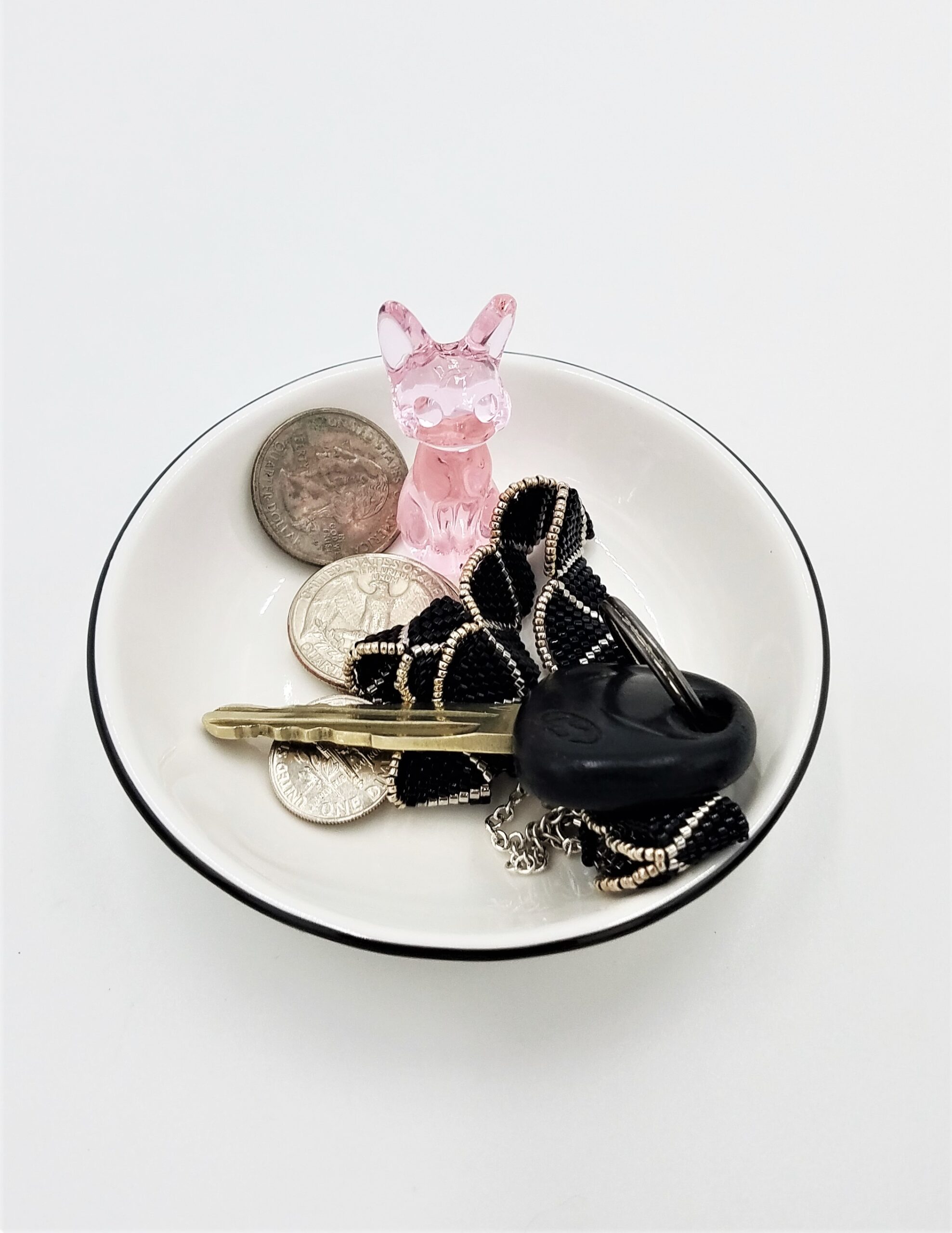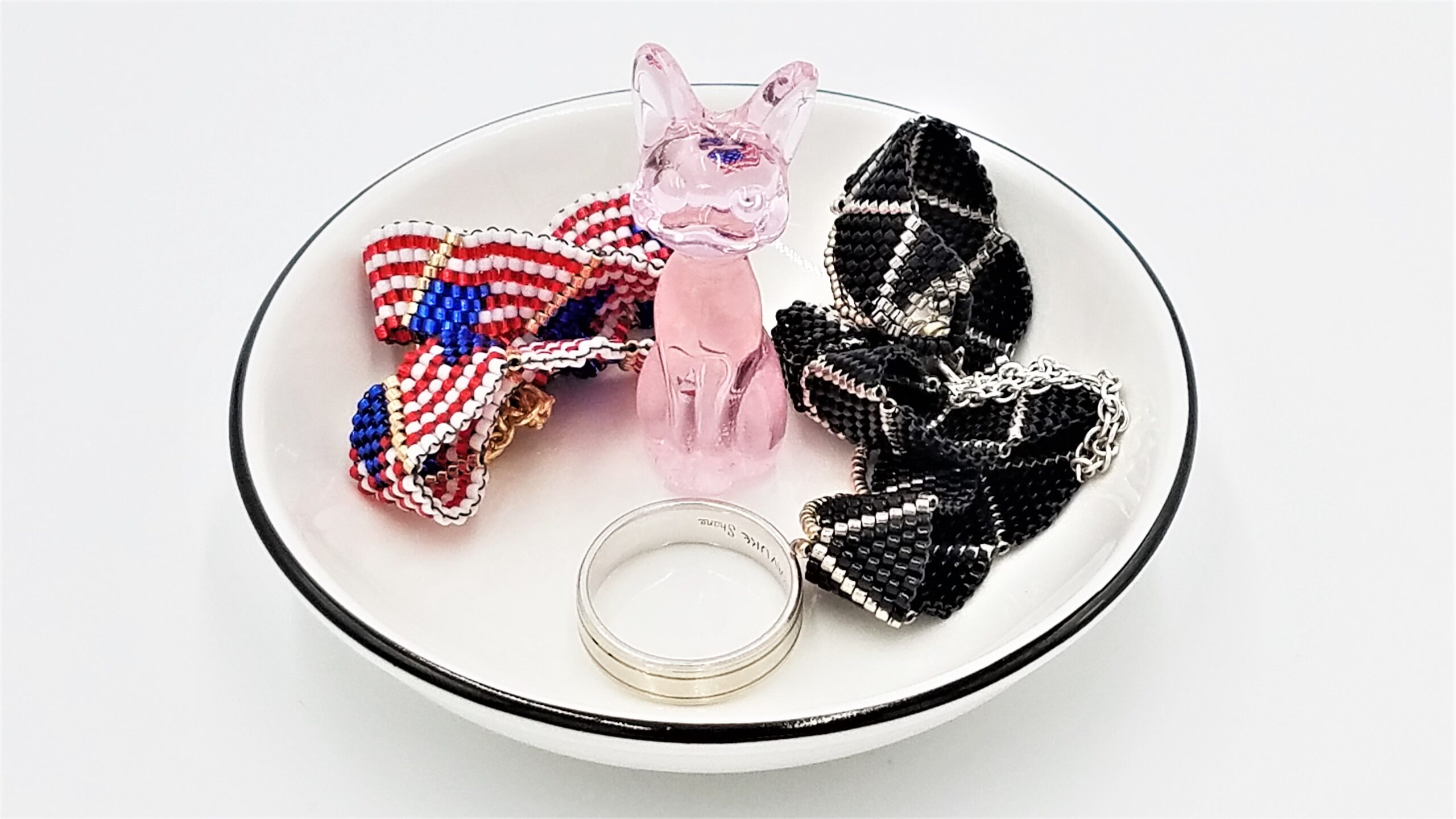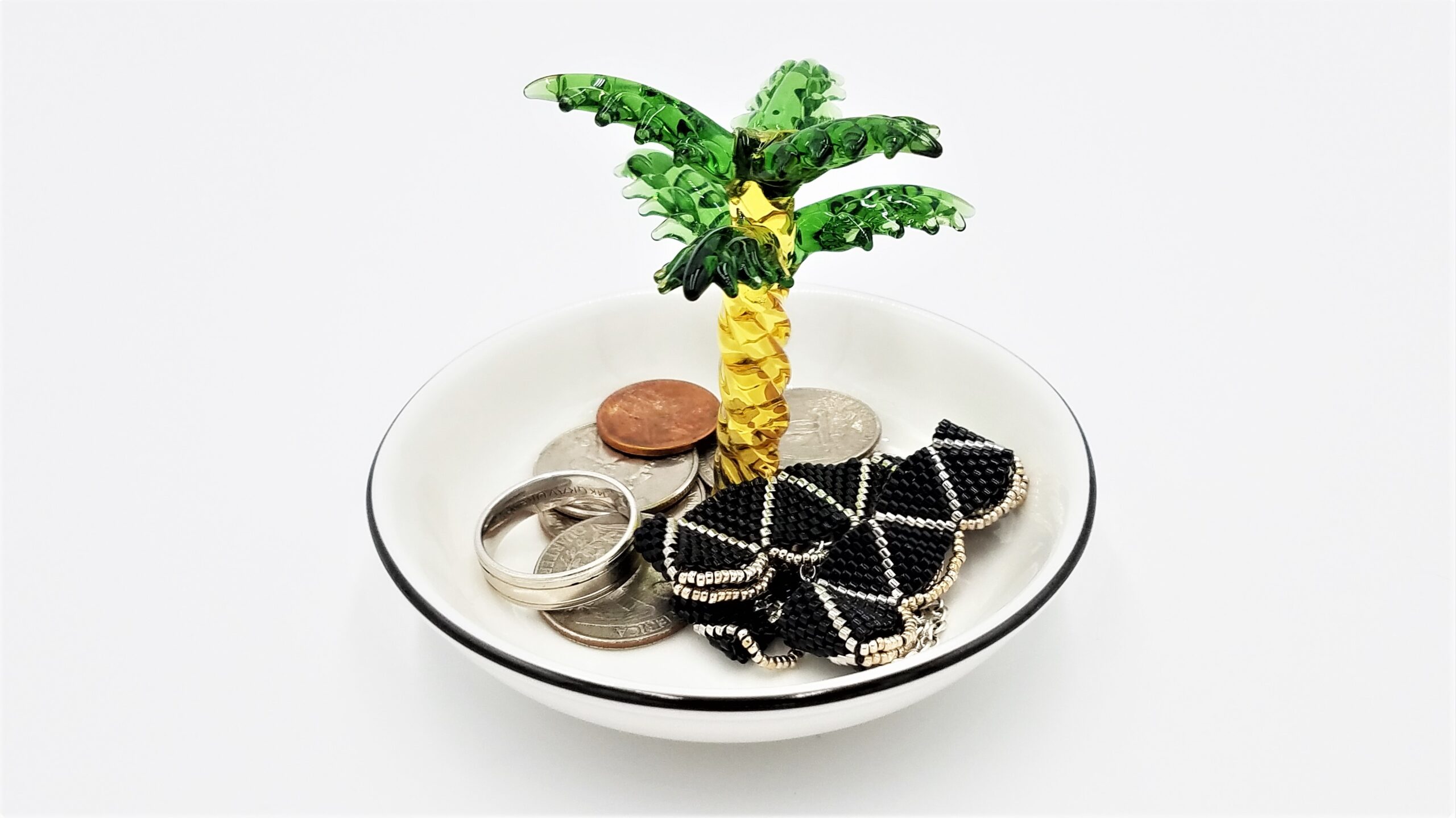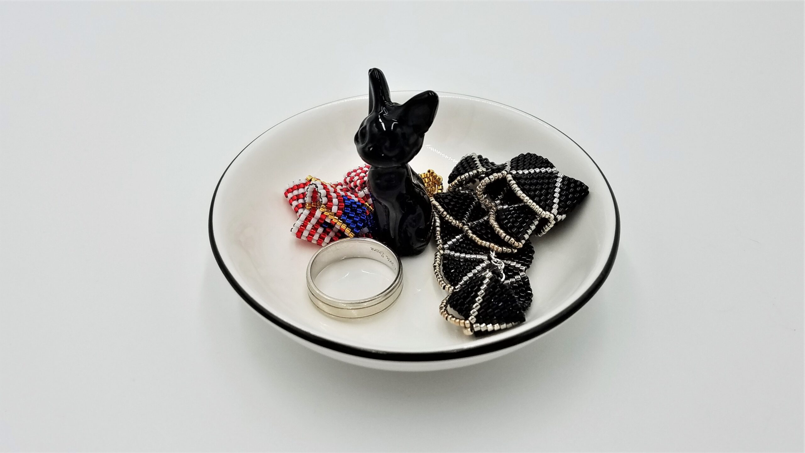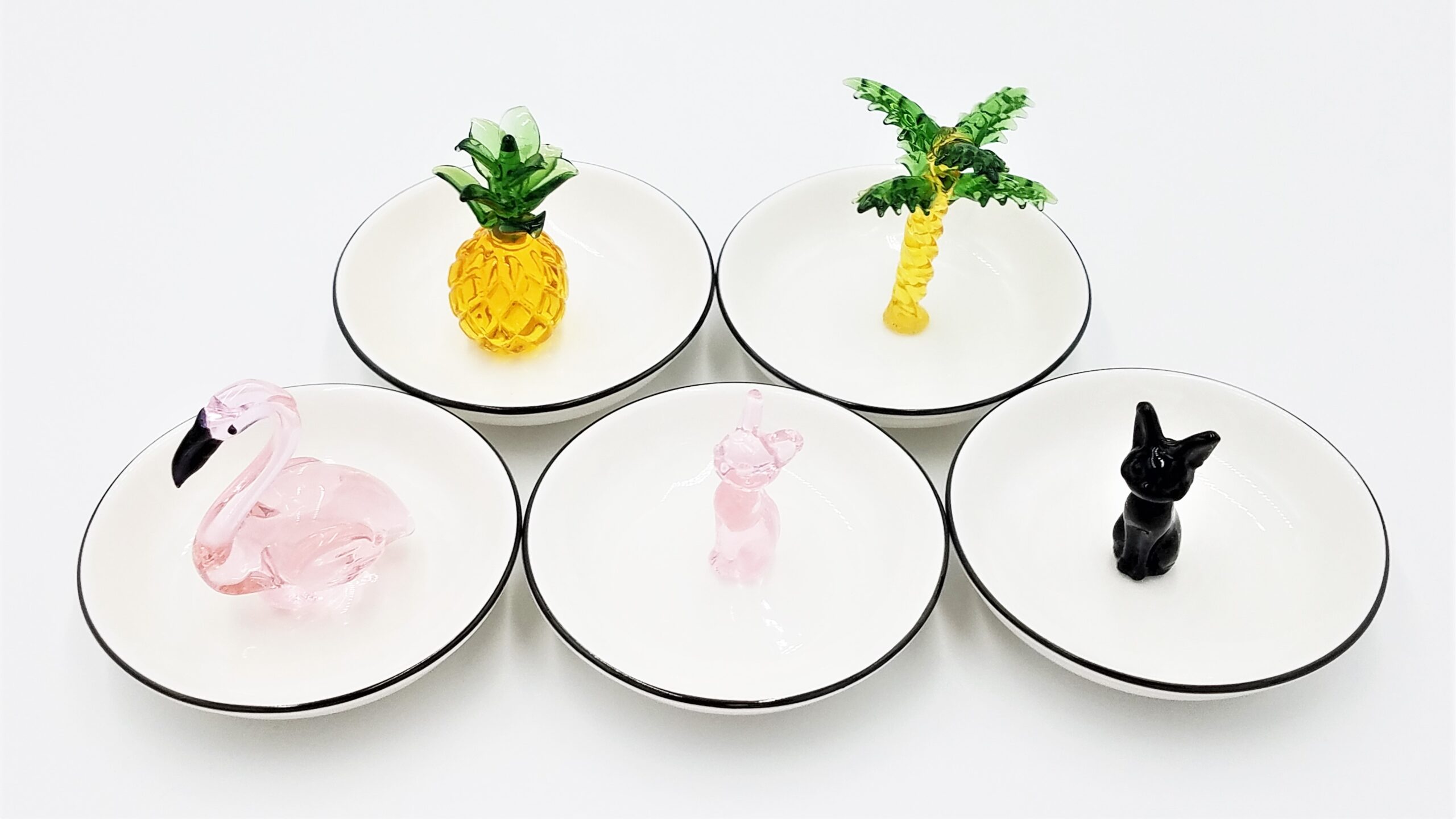 White ceramic jewelry dish bowl organizer with black cat(s), pink cat, flamingo, palm tree, pineapple, in dish. Size: 3.75″ diameter dish, ornament height varies by design.