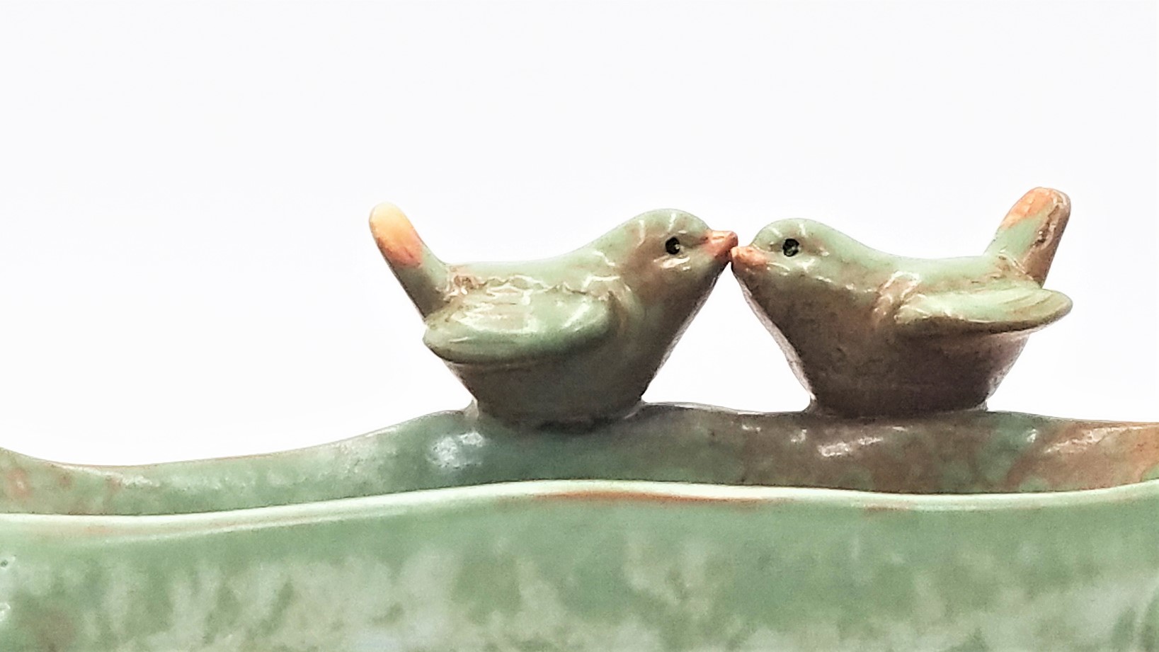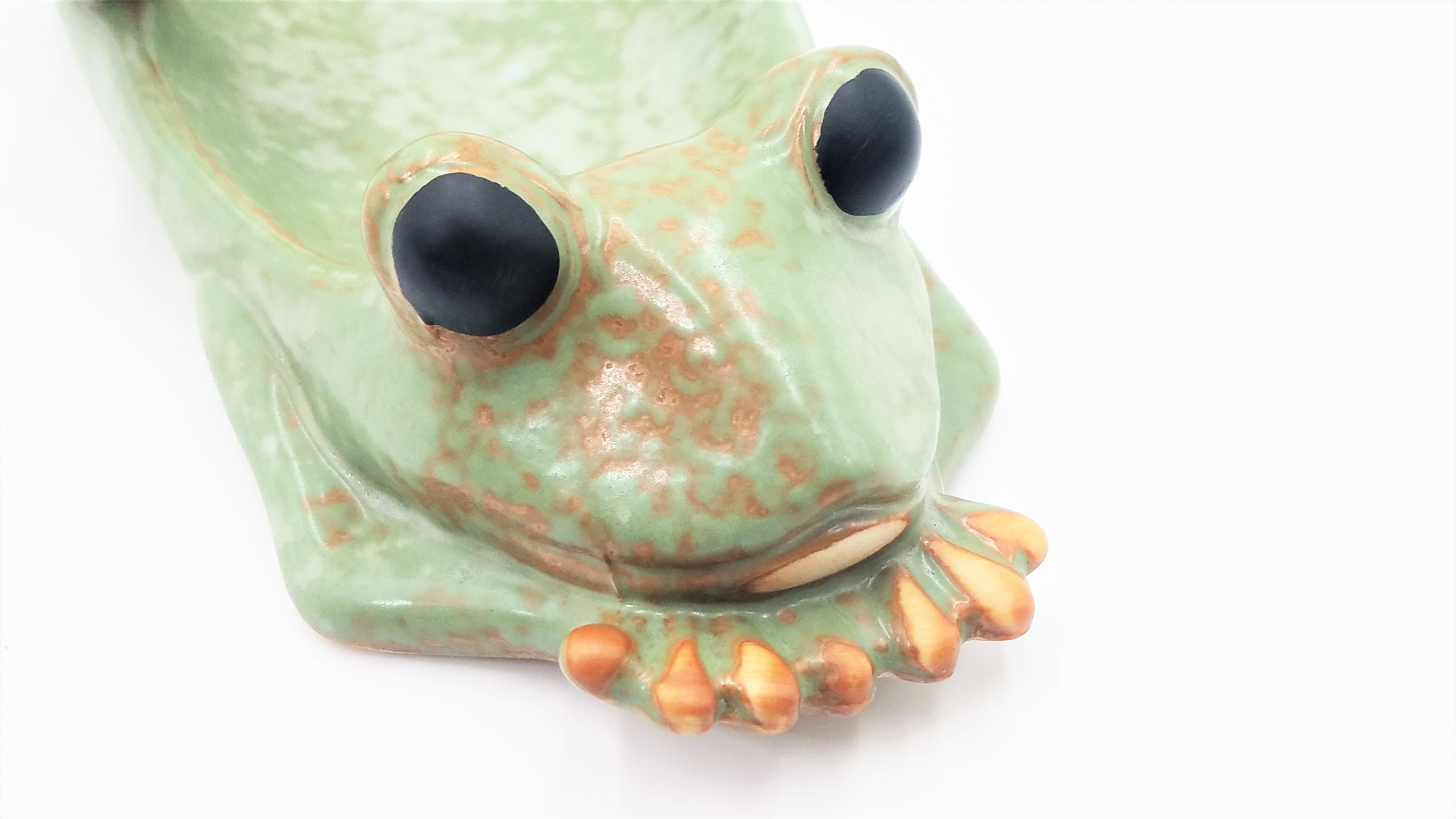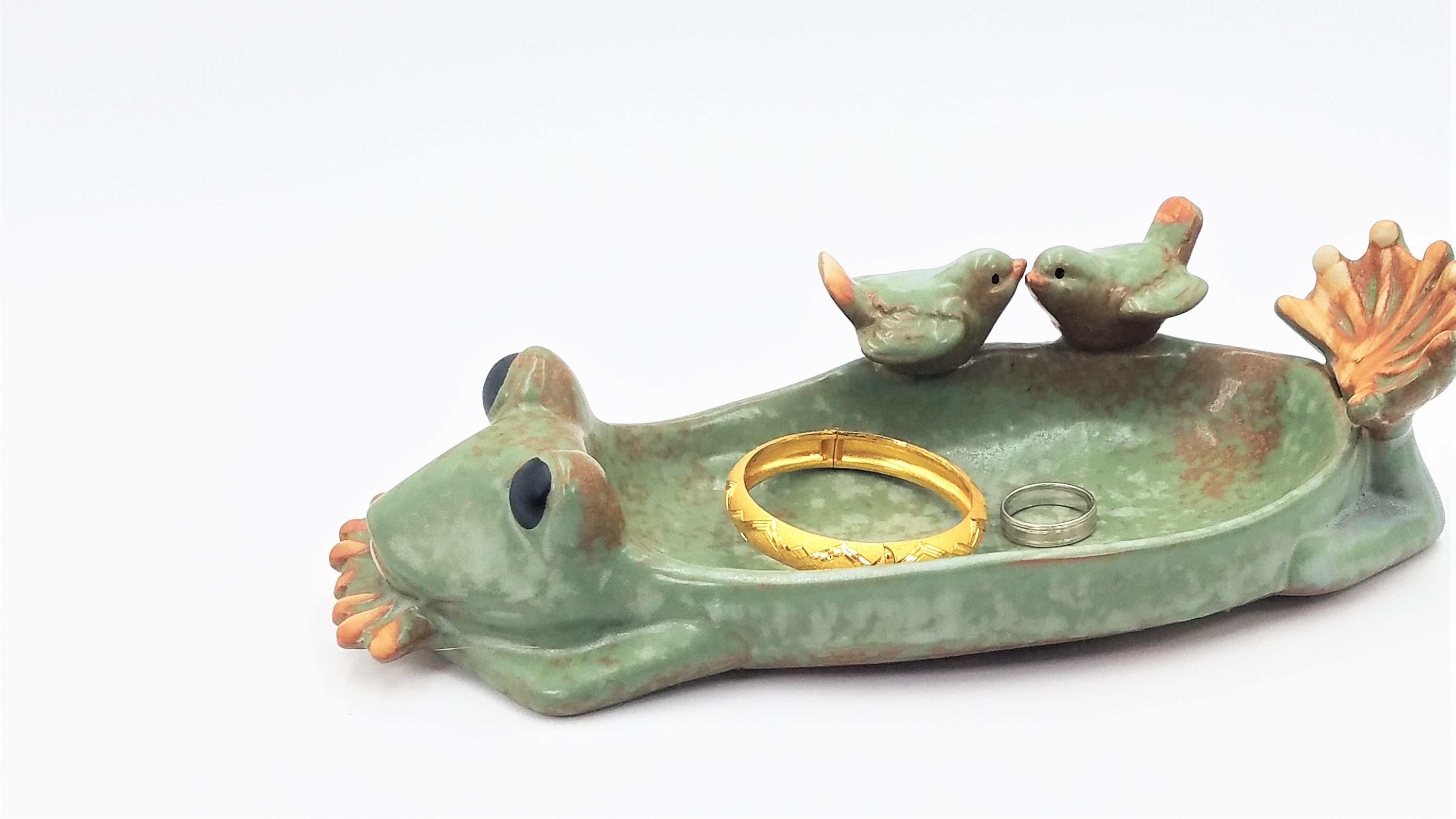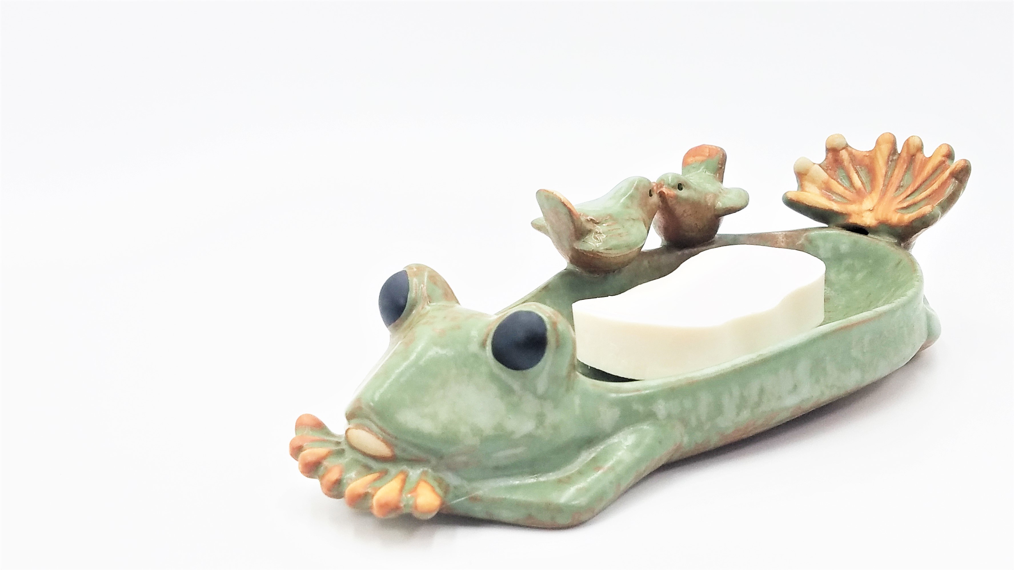 Creatively crafted in ceramic and intricately sculpted. Life-like detail of a resting frog with birds nesting lightly on his back.