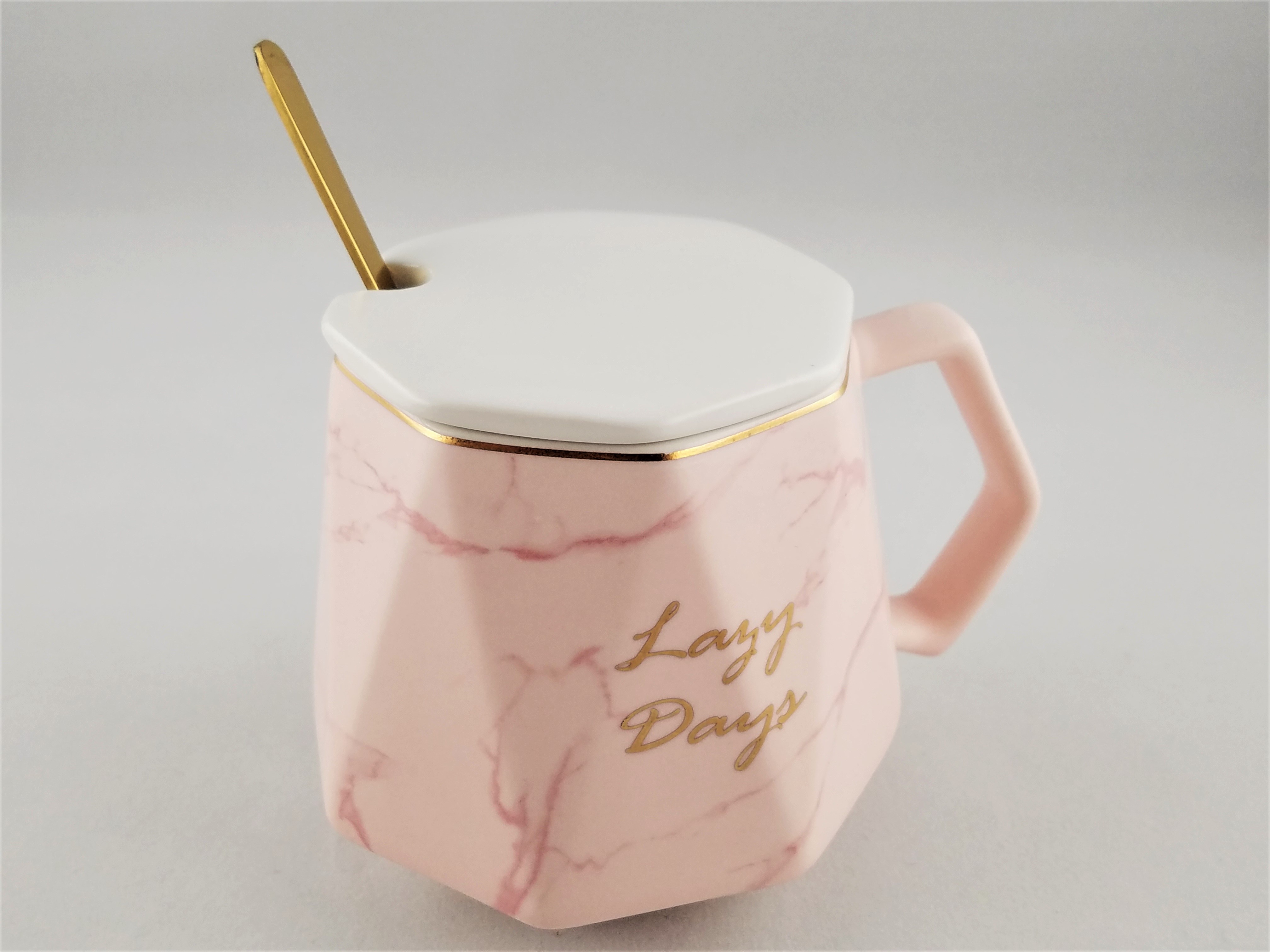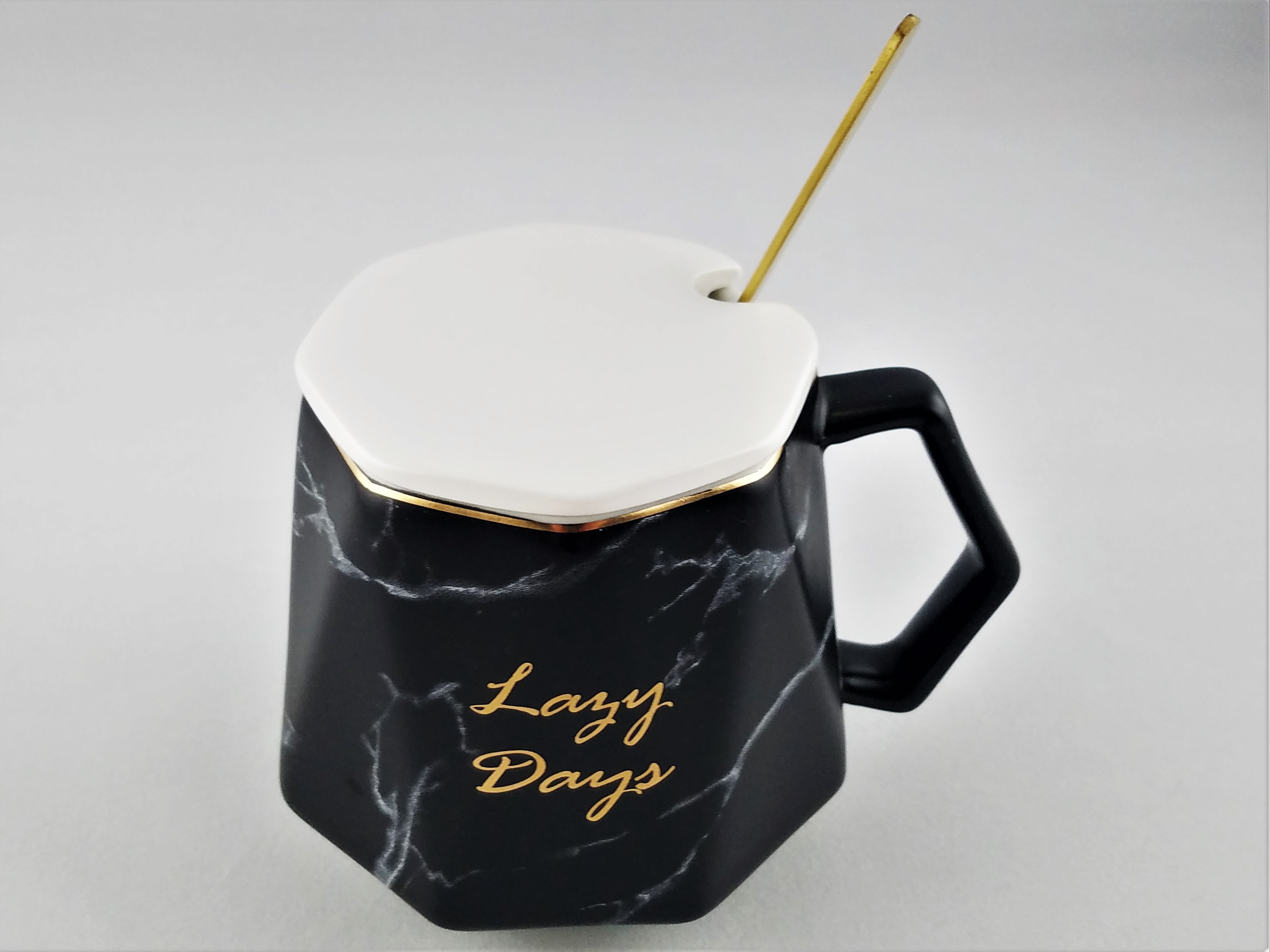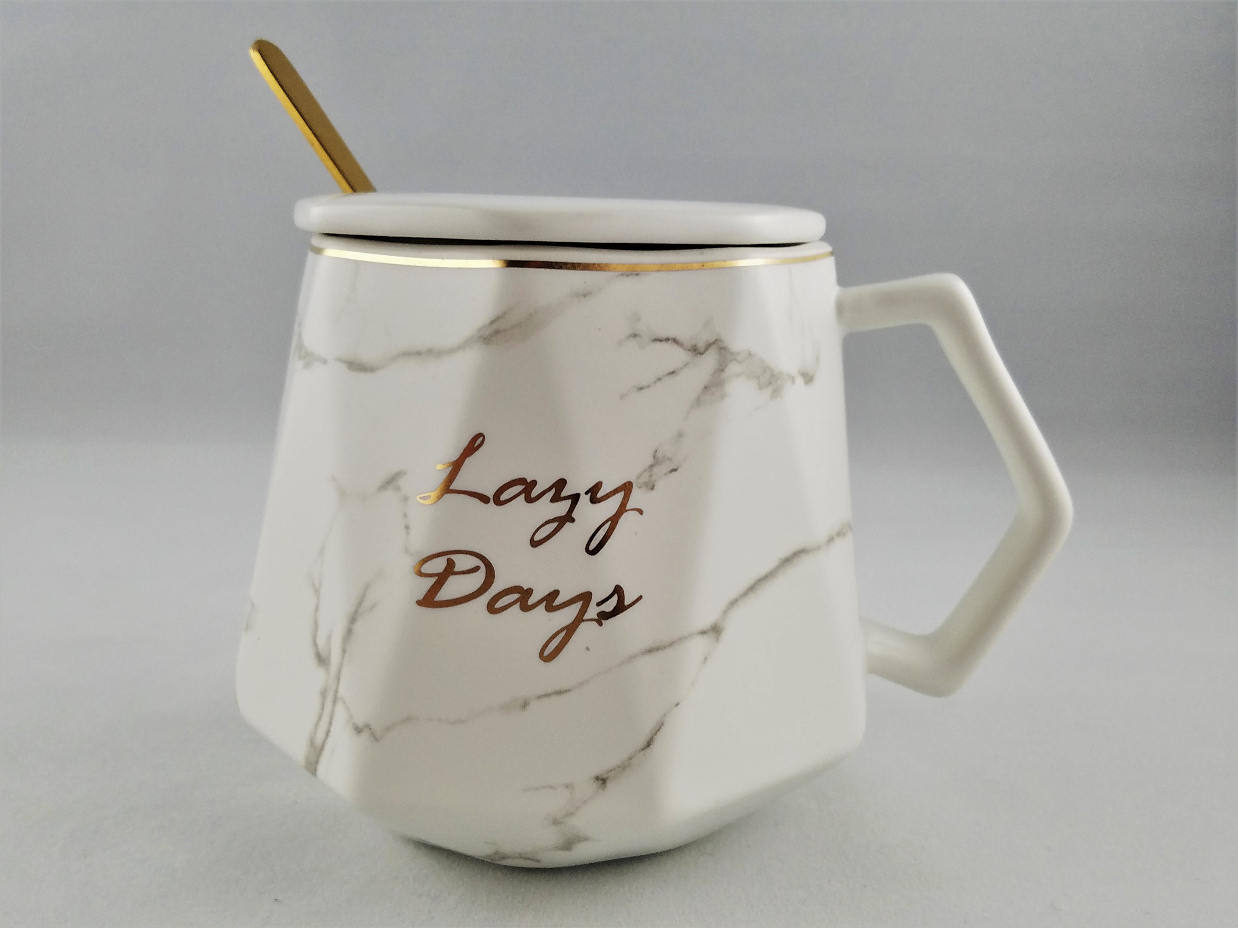 Ceramic coffee mug featuring marble design and Lazy Days inscribed in gold script. High quality ceramic cup that is durable and microwave/dish washer safe. Lid and spoon included.