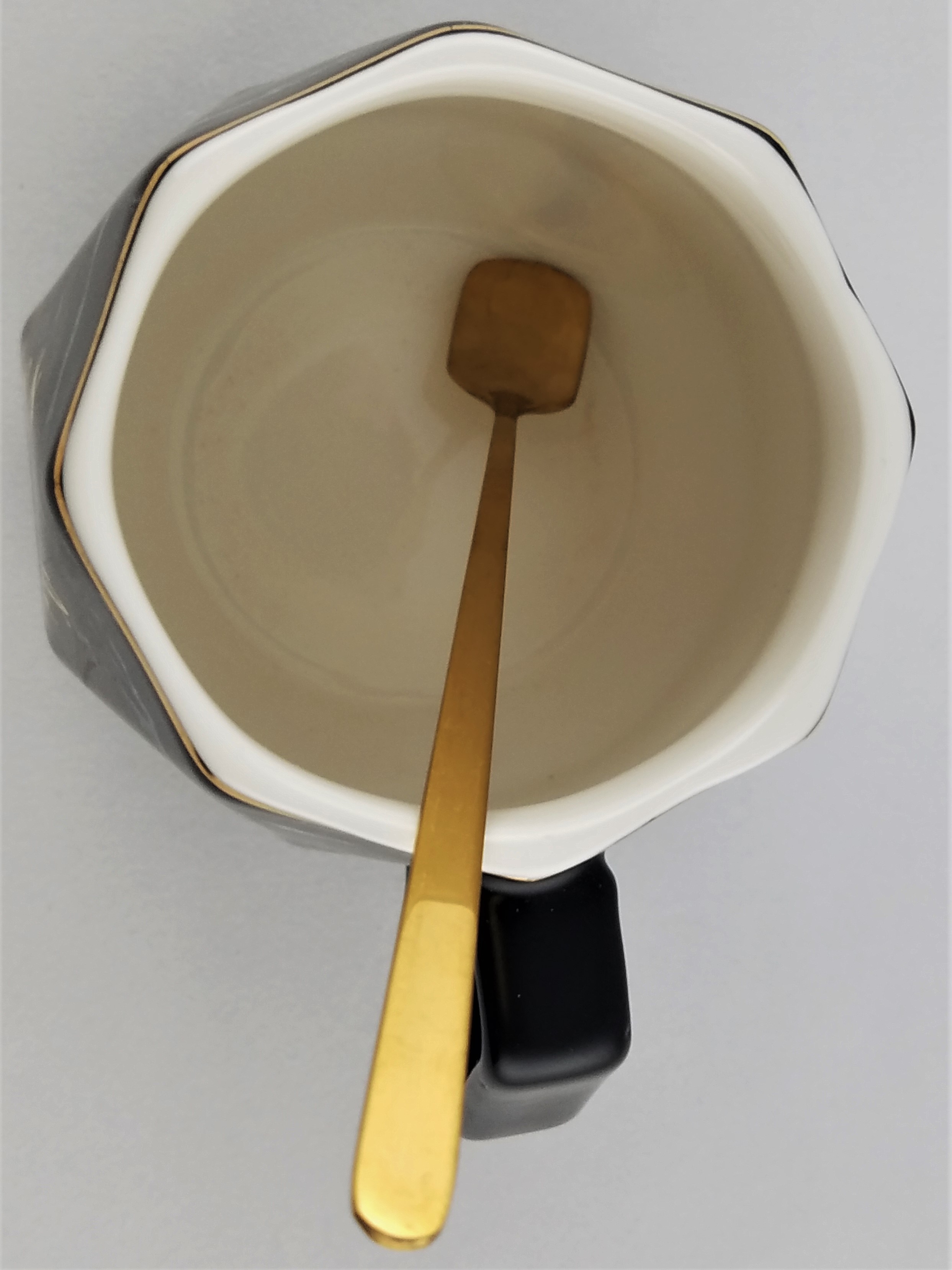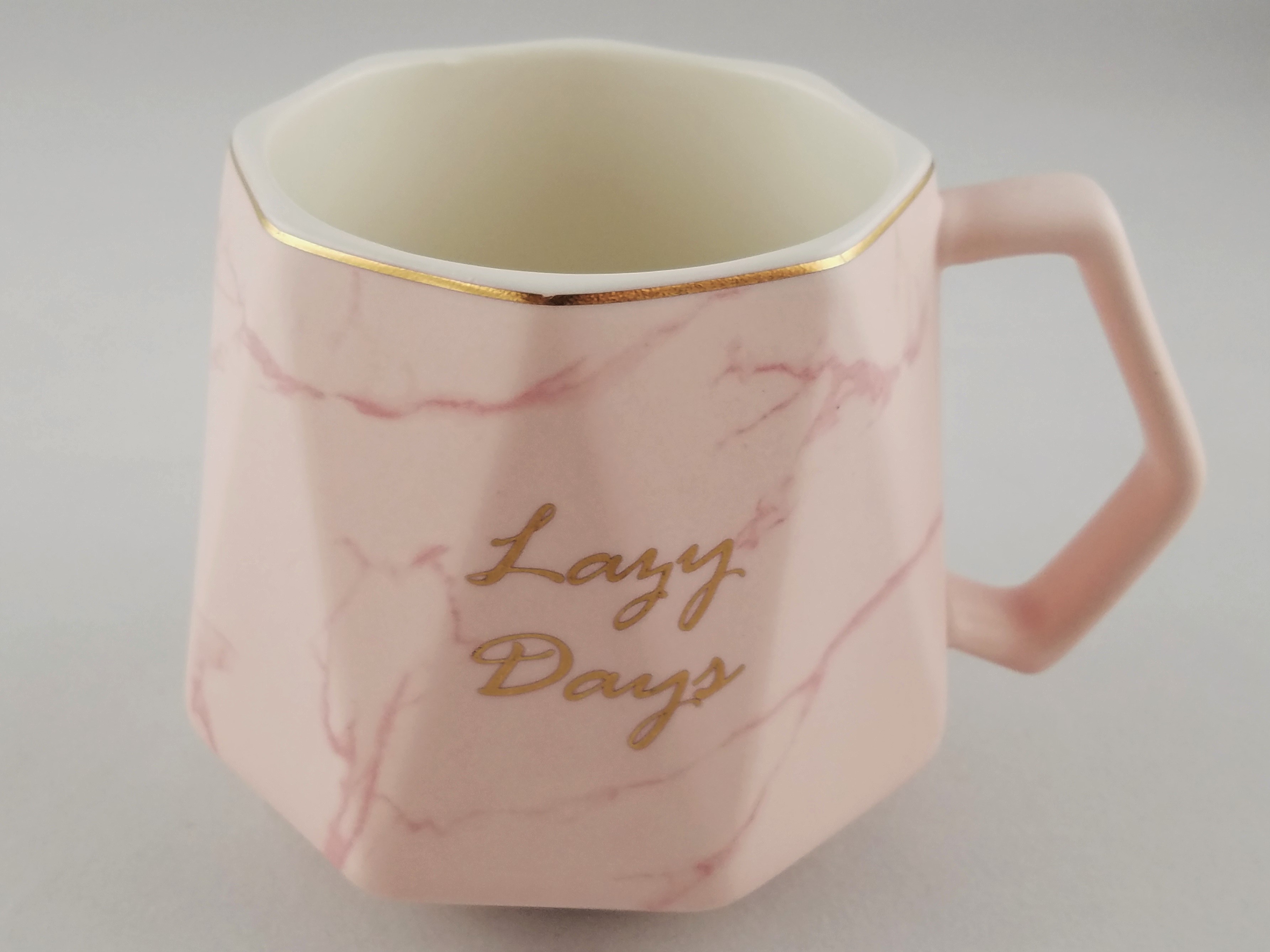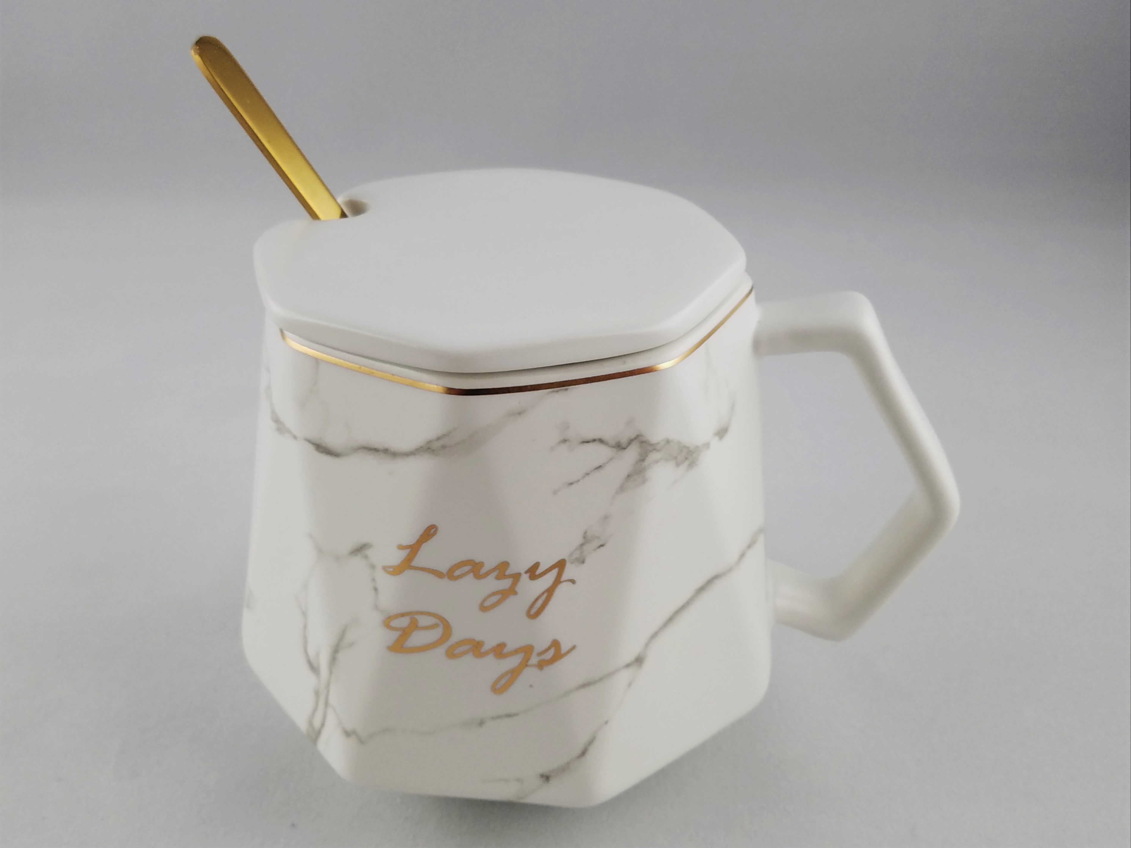 Ceramic coffee mug featuring marble design and Lazy Days inscribed in gold script. High quality ceramic cup that is durable and microwave/dish washer safe. Lid and spoon included.
