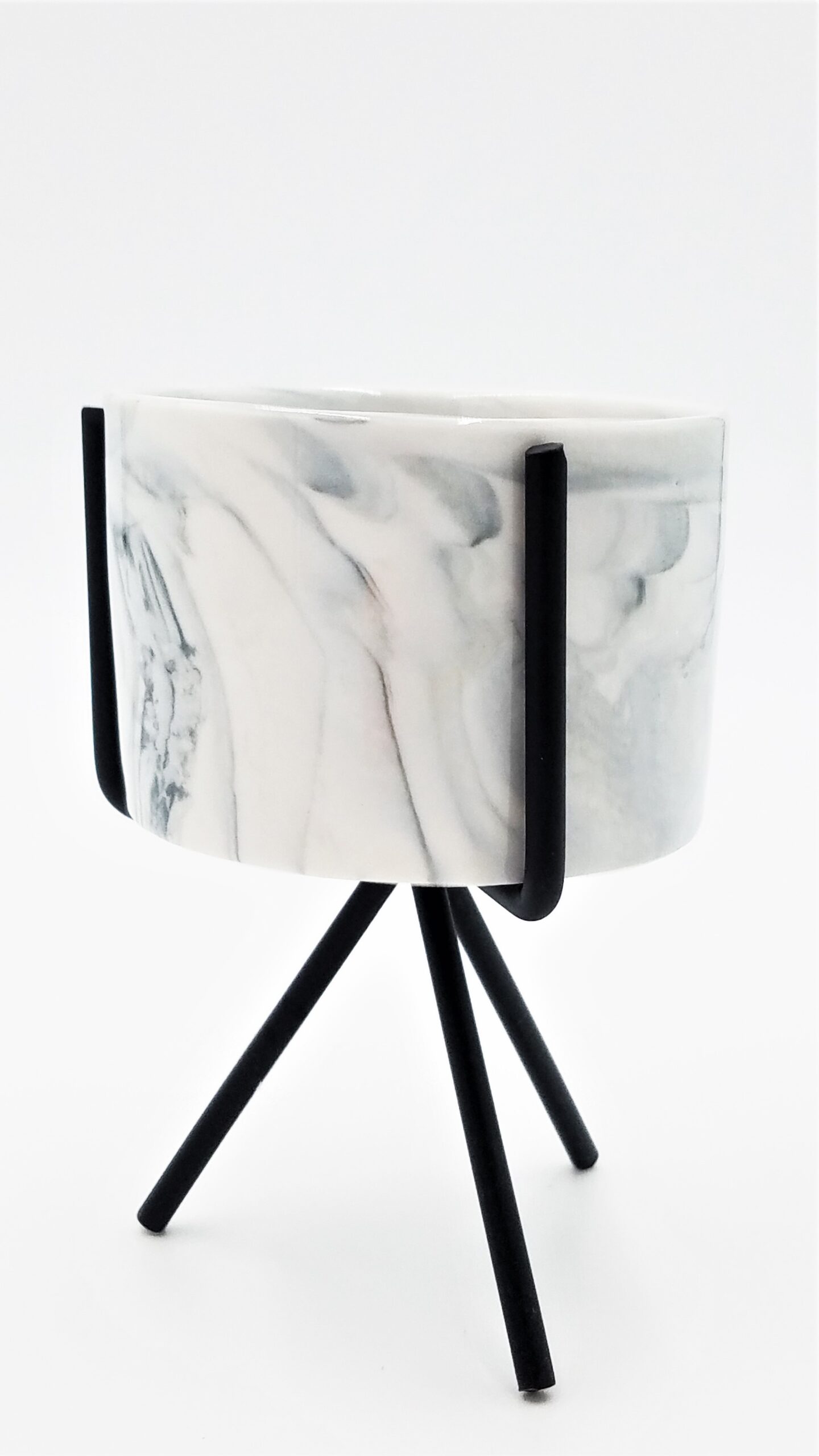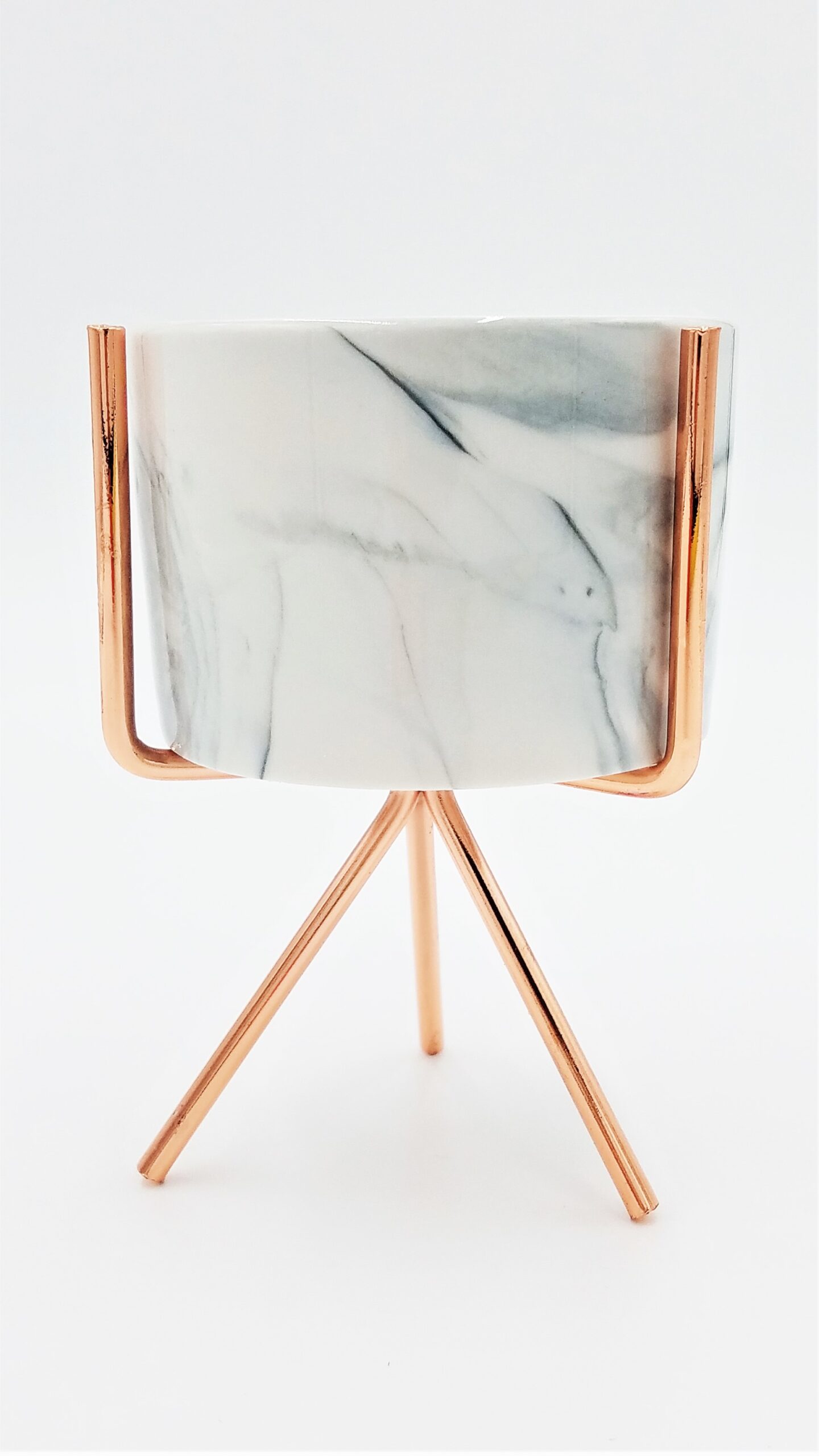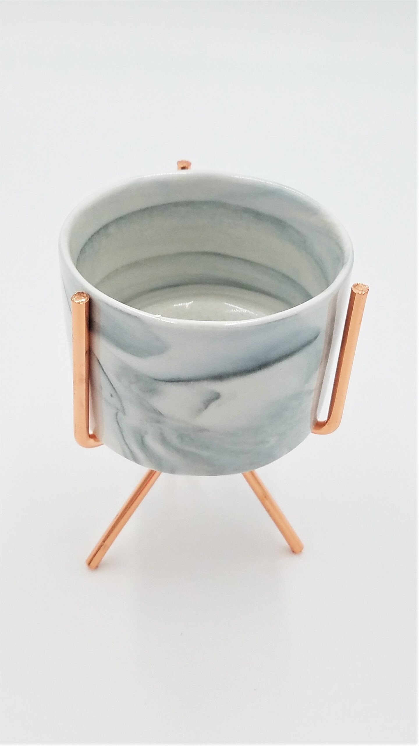 Marble exterior design. Pot height of 2.25″, depth of 1.88″, and stand height of 4.88″. Two stand finishes available; Black and Copper.