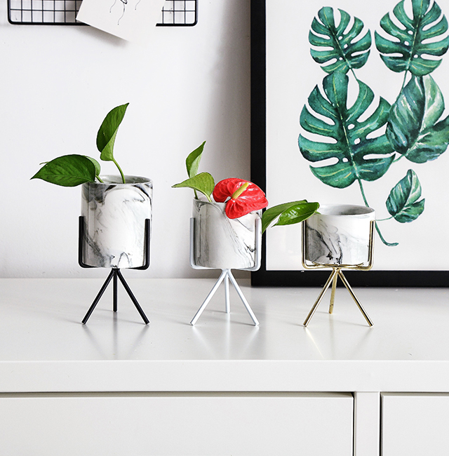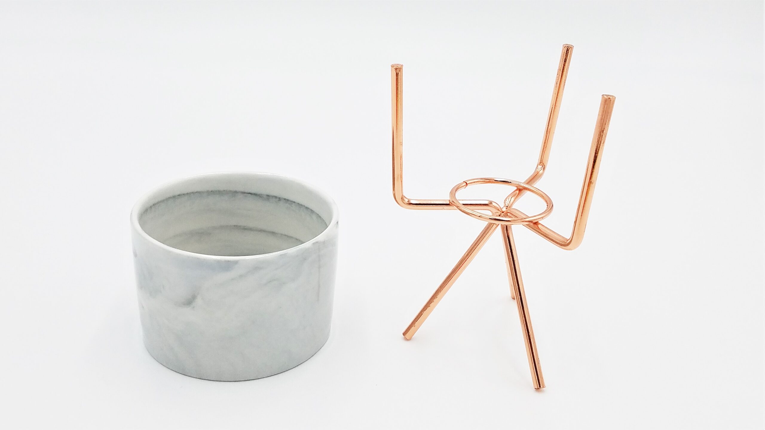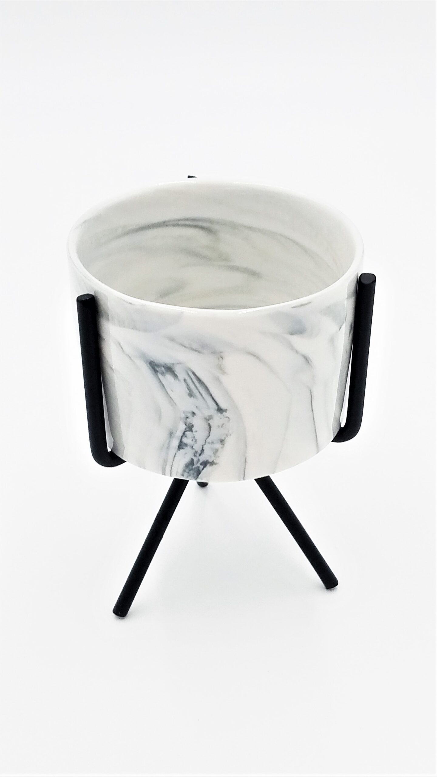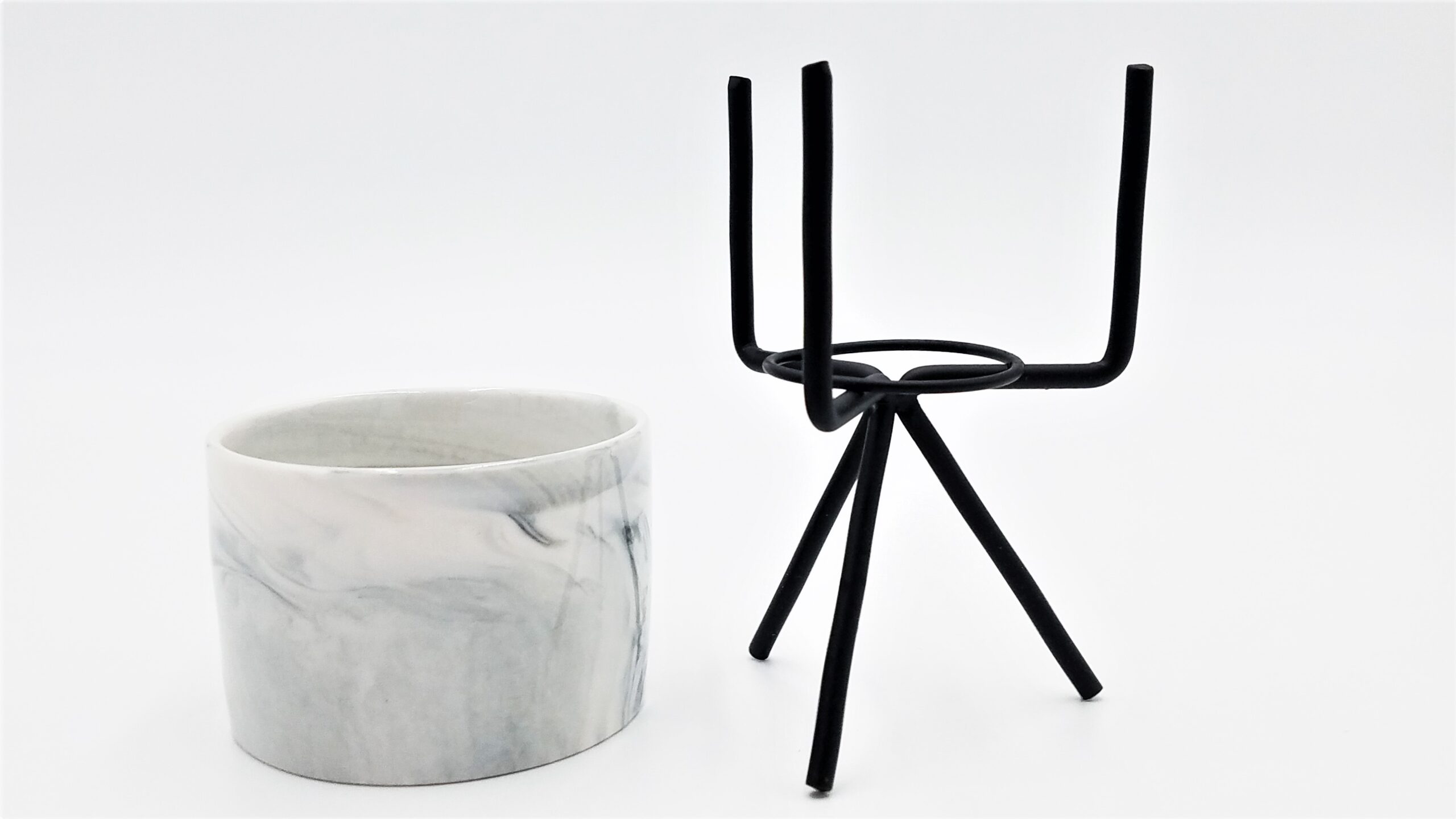 Marble exterior design. Pot height of 2.25″, depth of 1.88″, and stand height of 4.88″. Two stand finishes available; Black and Copper.