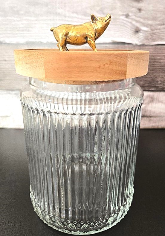 Round Ribbed Glass Jar with Pig on Wood Lid