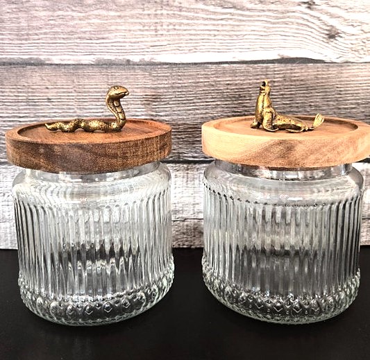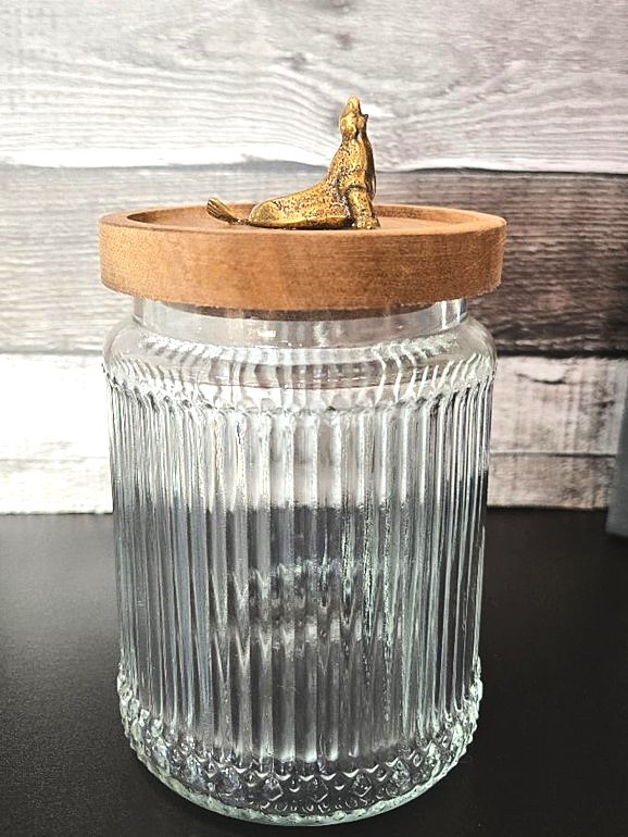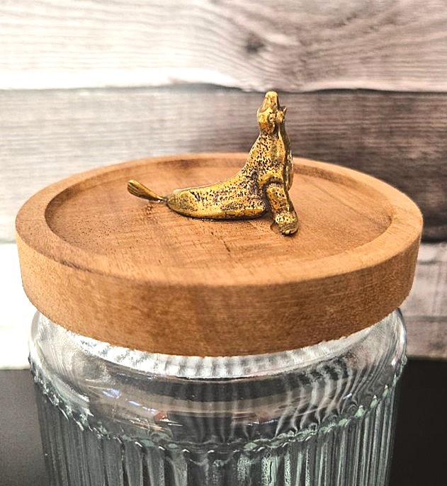 / Round Ribbed Glass Jar with Sea Lion on Wood Lid