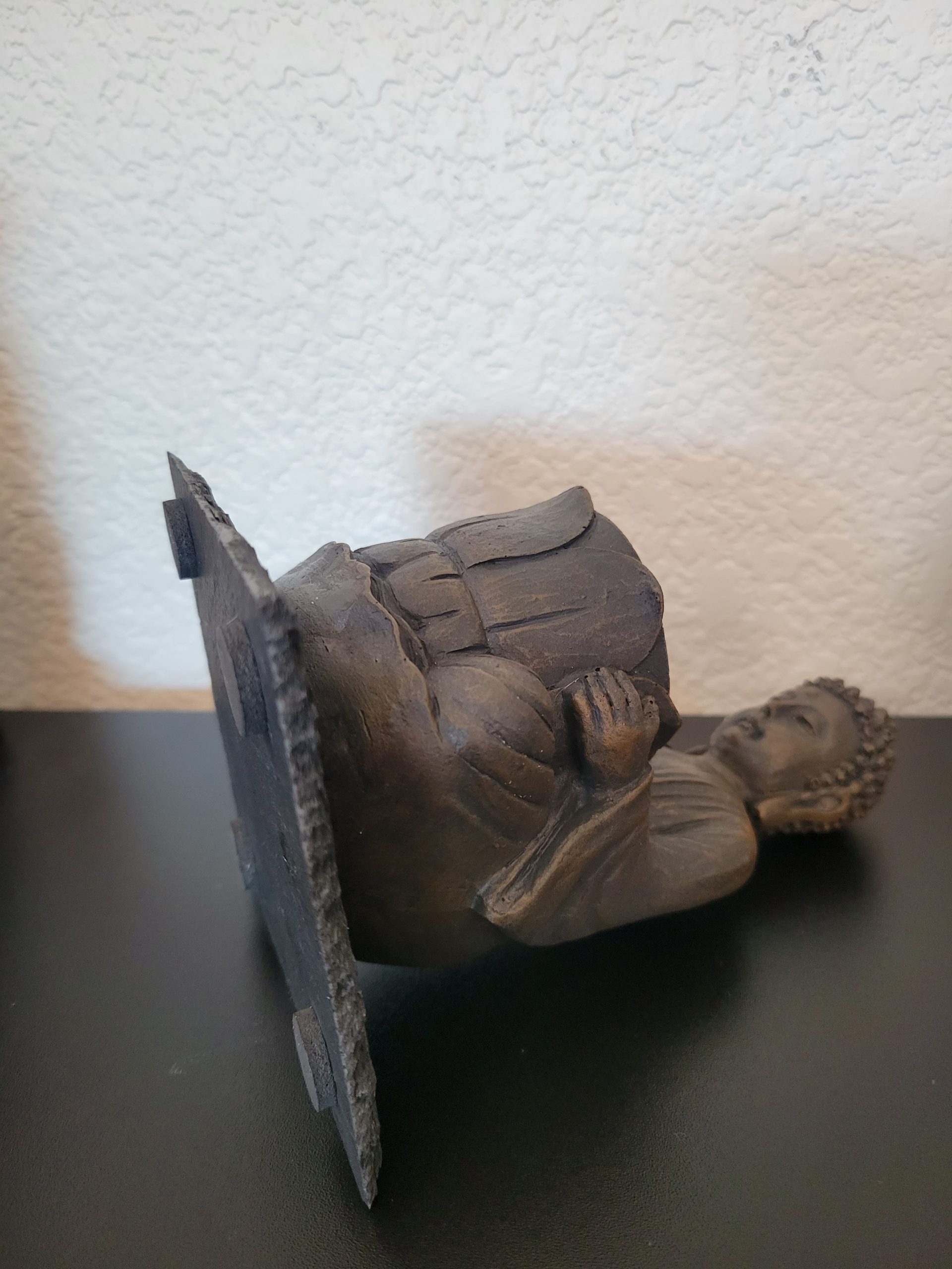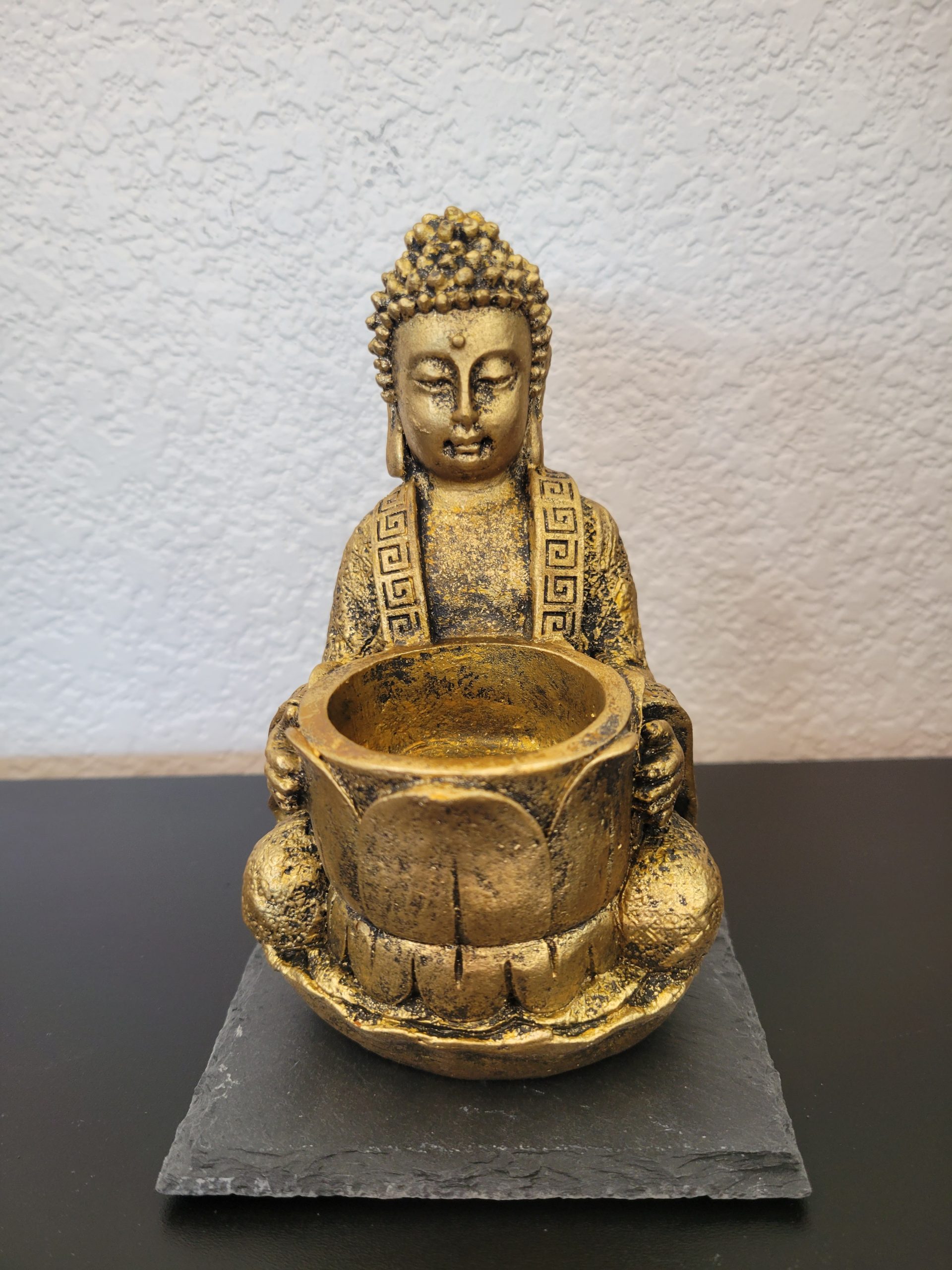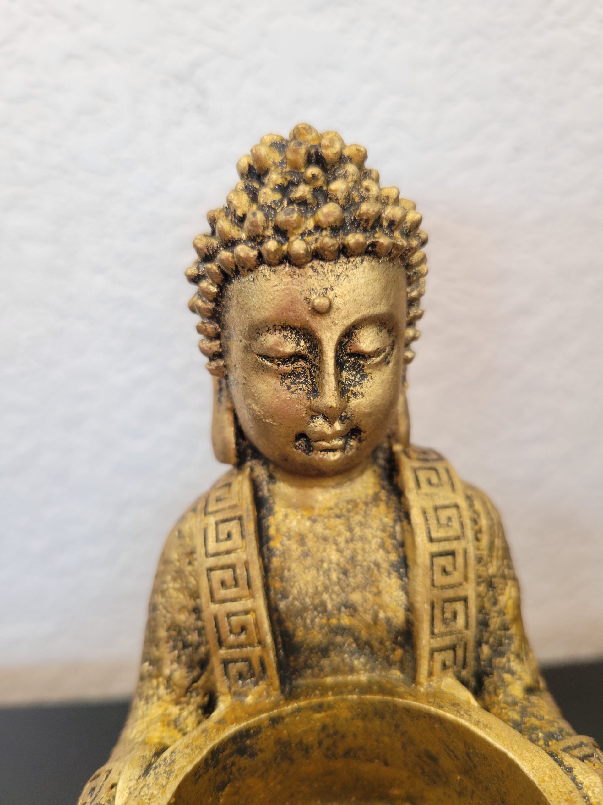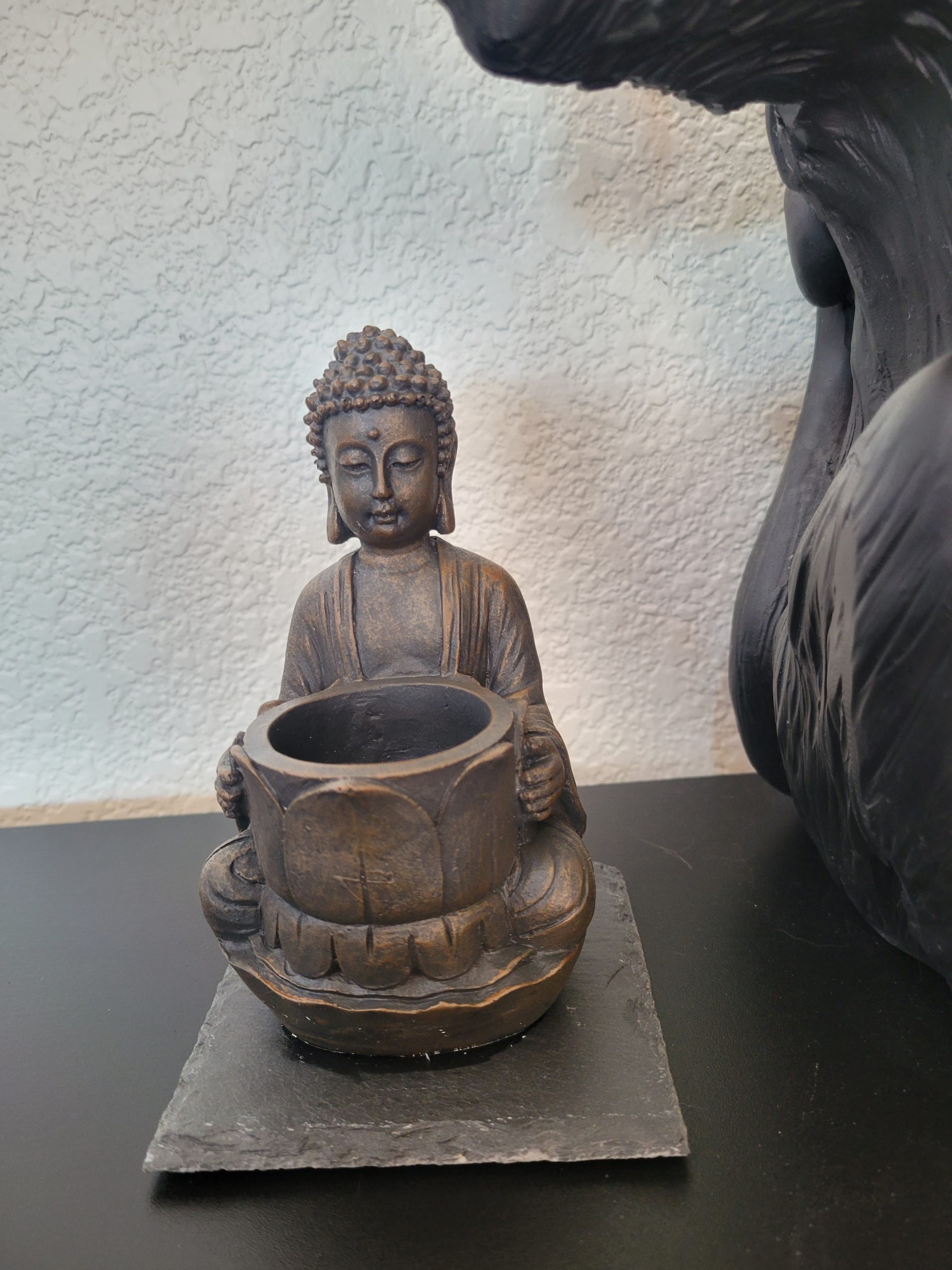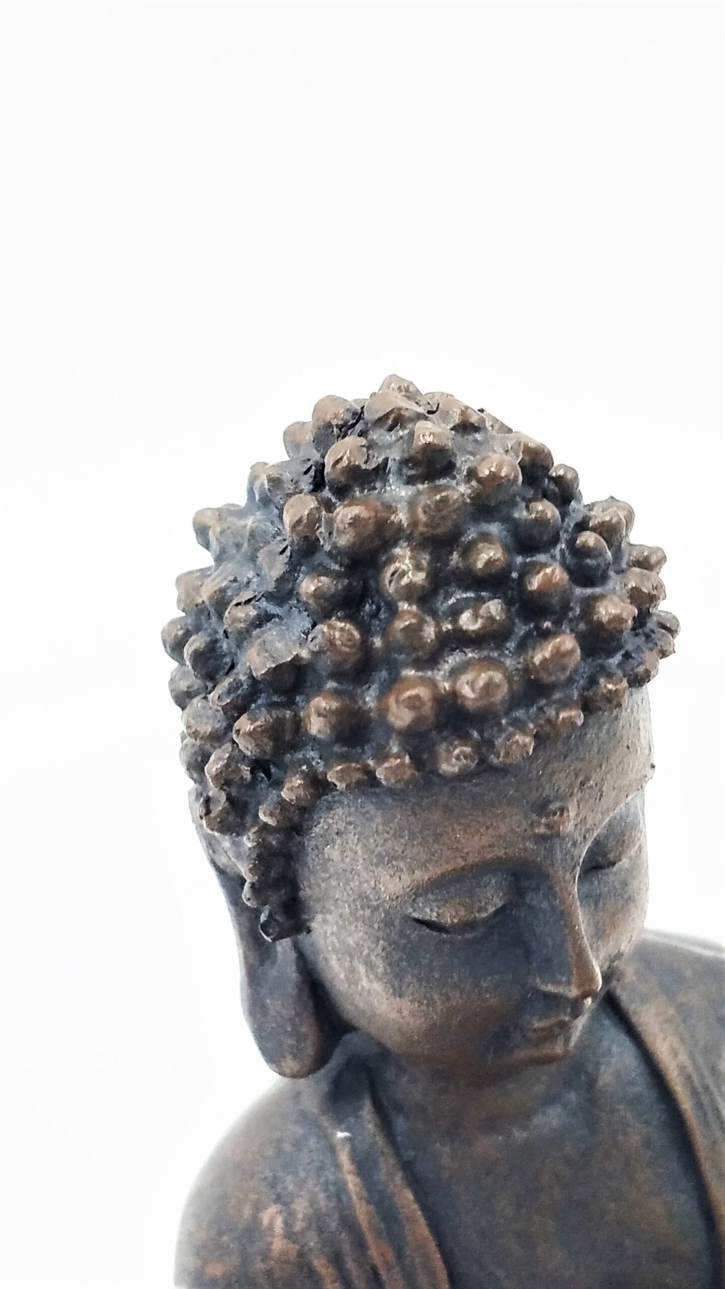 This Buddha design adds a Zen atmosphere and relaxing look to your indoor space. Natural stone color with a bronze finish and cracked details adding a natural element to your decor.